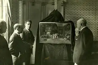 It is believed that The Spanish Wedding was inspired by a visit to a parish church in Madrid in preparation for his marriage to Cecilia de Madrazo.[1] When the painting was displayed in 1870, it brought Fortuny international praise by both the general public and by the art community.[10] Instead of being shown at the Paris Salon, the painting was exhibited at the gallery belonging to Adolph Goupil at No. 9 Rue Chaptral, Paris.[15] Goupil was a major art dealer in the 19th century.[16] The Spanish Wedding was quickly sold to Adèle Cassin, for 70,000 francs.[14] This was one of the highest prices a painting had commanded to date, excepting Meissonier's 1814, la Campagne de France, which sold in 1866 for 85,000 francs.[14] The Spanish Wedding catapulted Fortuny to international fame and his paintings were in high demand the rest of his career.[10]