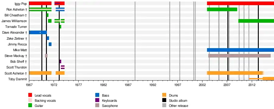 Fun House was also poorly received by critics and the general public. Alexander was dismissed in August 1970 after arriving at the Goose Lake International Music Festival too drunk to play.[18] He was replaced by a succession of new bass players, including former roadie Zeke Zettner[19] and James Recca. Around this time, the band expanded their lineup by adding a second guitar player, roadie Bill Cheatham,[10] who was eventually replaced by James Williamson, a childhood friend of the Ashetons and Alexander.