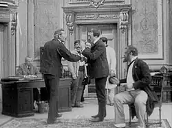 All scenes but scene 2 are composed of one single wide shot filmed by a static frontal camera. In scene 2, after an initial frontal view, the camera pans first to the right and then to the left to follow the workers rushing past it, placing the viewer at the centre of the action.[1] Richard Abel mentions The Strike as an early example of a transformation of film discourse, where frame changes are used within a continuous flow of action, "not only to reconstruct a synthetic diegetic space for that action, but also to elicit, suspend and fulfill narrative expectation". He stresses in particular how it creates an unusually "deep space" playing area and how in scene 2 the camera pans to follow the crowd "perhaps in an attempt to reproduce the verisimilitude of an actualité". [8]