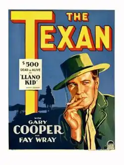The Texan is a 1930 American Western film directed by John Cromwell and starring Gary Cooper and Fay Wray.[2] Based on the short story "The Double-Dyed Deceiver" by O. Henry, the film is about a daring bandit called the Llano Kid who shoots a young gambler in self-defense and is forced to hide from the law. He is helped by a corrupt lawyer who involves the bandit in a scheme to swindle a Mexican aristocrat whose son turns out to be the young gambler killed by the Llano Kid. The screenplay was written by Daniel Nathan Rubin, and the story was adapted for the screen by Oliver H.P. Garrett and Victor Milner. Produced by Hector Turnbull for Paramount Pictures, The Texan was released in the United States on May 10, 1930.[3] The film received positive reviews upon its theatrical release.[4]