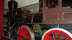 In 1927, the Texas was placed in the basement of the newly constructed Cyclorama, but remained unrestored or altered from its retirement appearance in 1907. As stated, during its service life, the Texas underwent numerous rebuilds and modifications. Most notably, the engine's smokestack was replaced with a diamond design suited for coal-burning, and its cowcatcher had been replaced with a wooden step for use in yard service. The locomotive's current tender originally belonged to the United States Military Railroad's Dalton locomotive, built in 1864 by the Mason Machine Works of Taunton, Massachusetts.[6][7][8] The Dalton was sold to the Western & Atlantic after the war, renamed William MacRae, and operated on the W&A until retired in 1890, with its tender salvaged for the Texas when the latter was briefly returned to service in 1900.