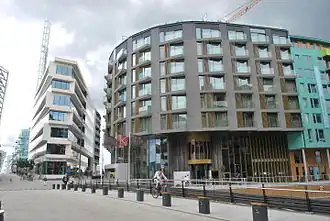 The Thief is a luxury waterfront hotel[1] located on Landgangen 1 on the islet of Tjuvholmen (Thief Islet) in Oslo, Norway, designed by the award-winning Mellbye Architects.[2] The hotel opened on January 9, 2013, and is currently the only hotel[3] designated as a Design Hotel in Norway. The Thief has 119 rooms and is a part of the Nordic Hotels & Resort chain owned by Forbes-billionaire Petter Stordalen.[4] It is situated right next to the Astrup Fearnley Museum of Modern Art, and thanks to a collaboration between the two, there is a large collection of contemporary art in the hotel. According to press reports, the hotel owned by Tjuvholmen KS had a price tag of 720 million NOK,[5] giving each of the 119 rooms an average cost price of more than one million dollars.