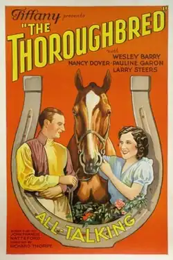 The Thoroughbred is a 1930 American pre-Code sports drama film directed by Richard Thorpe and starring Wesley Barry, Judith Barrett, and Pauline Garon.[1] It was produced and distributed by Tiffany Pictures.[2] It was released the same year in Britain by Gaumont British under the alternative title, Riding to Win.