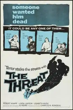 The Threat is a 1960 American crime film directed by Charles R. Rondeau, written by Jo Heims, and starring Robert Knapp, Linda Lawson, Lisabeth Hush, James Seay, Mary Castle and Barney Phillips. It was released by Warner Bros. on March 12, 1960.[1][2][3]