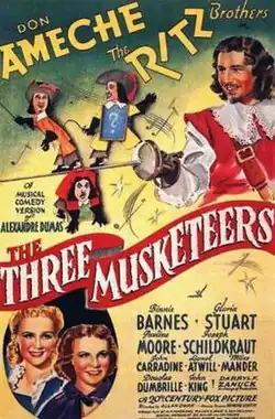 The Three Musketeers is a 1939 musical comedy film adaptation of Alexandre Dumas's 1844 novel The Three Musketeers directed by Allan Dwan and starring Don Ameche as d'Artagnan, with the Ritz Brothers as his cowardly helpers. While the film can be found online, it did have an original copyright notice and renewal.[1][2]