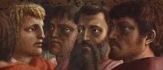 Only two of the disciples can be identified with any degree of certainty: Peter with his iconographic grey hair and beard, and blue and yellow attire, and John; the young beardless man standing next to Christ. John's head is reminiscent of Roman sculptures, and it is reflected in the very similar face of another disciple on the right. The person next to this disciple is assumed to be Judas, whose dark and sinister face mirrors that of the tax collector.[12] It has been speculated – first by Vasari – that the face on the far right is a self-portrait of Masaccio himself, as Thomas.[19]