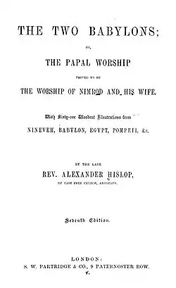- Hislop, Alexander (1903). The two Babylons, or, The papal worship proved to be the worship of Nimrod and his wife : with sixty-one woodcut illustrations from Nineveh, Babylon, Egypt, Pompeii, &c. London: S.W. Partridge.