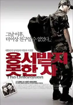 The Unforgiven (Korean: 용서받지 못한 자; RR: Yongseobatji mothan ja) is a 2005 South Korean drama film directed by Yoon Jong-bin. Turning painful experiences of his own compulsory military service into a narrative of three young men, director Yoon presses the hot-button issue of military service in contemporary South Korea. Yoon's controversial exposé of psychological and physical violence within the ranks stimulated a national dialogue on the subject.[2][3]