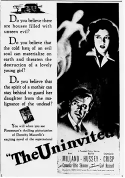 In contemporaneous reviews, some critics praised the film for being frightening and compared it to other horror films. Karl Krug, writing in the Pittsburgh Sun-Telegraph, praised the film and called it "cold shiver melodrama at its best, and it uses no melodramatic claptrap or sliding panel hocus-pocus to achieve its cold chill ends".[40] Krug noted that the film is told with a "deadly seriousness and very little comedy relief. Its characters are intelligent adult human beings, but there is no earthly explanation offered for the ghosts that haunt the house", and commented that audiences should not "look for the conventional 'horror' yarn, all tricked up with the sleight of hand gadgets that usually accompany such stuff in the movies. This one will really give you the shudders, and there are a few places where the suspense will freeze the marrow in your bones, to say nothing of the blood in your veins."[40] These statements were echoed by other reviewers, including Boyd Martin of The Courier-Journal, who commented that he generally loathed "these so-called shocker films" and that The Uninvited is "a most intelligent thriller".[41] Outside the United States, Herbert Whittaker of The Gazette Montreal said: "The movie-goer who gazes stoney-eyed at the usual type of screen thriller should be able to achieve genuine goose-pimples as this one unravels", noting that the film does not set itself in a "cardboard grave yard, knee-deep in that animated whipped cream that Hollywood technicals like to imagine resembles fog" and that the film "will have you clutching the arms of your theatre-seat".[42]