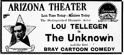 The Unknown is a 1915 American silent drama film produced by Jesse Lasky and distributed by Paramount Pictures. Directed by George Melford, it stars Lou Tellegen, Theodore Roberts, and Dorothy Davenport.[1][2]