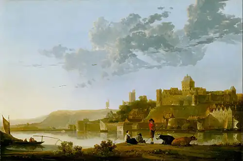 The Valkhof at Nijmegen typifies the Dutch landscape. A small boat filled with fisherman wait to capture lobsters. Two fat cows sit at the bank of the river, with their herder and two guests. The herder's red jacket is the focal point, drawing the eye in and breaking up the muted tones of the rest of the painting. Across the river, the looming Medieval architecture is bathed in a warm golden light from the seemingly setting sun. Boats float peacefully down the water banks, not disturbing the water. A windmill pokes up from the cliff face. Small, chunky clouds hover peacefully over the bay. Overall, the feelings of peace and tranquility run through the painting, with the stillness of the cattle, people, and water all reflecting the peaceful nature of the painting.