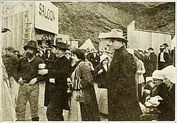 The centerpiece of the film's plot was a gold-mining boomtown, an elaborate set built at Betzwood and populated during production by hundreds of extras, including many genuine Pennsylvania miners who were brought to Lubin's facilities.[9] Instead of just filming scenes on a completed set, Fielding's cameramen shot daily footage of Lubin carpenters as they erected the town. That footage of buildings in various phases of construction was then edited into the photoplay. That filming strategy did not go unnoticed by film critics and reporters. After seeing an early cut of the film in December 1914, Stephen Bush—the reviewer for the trade weekly The Moving Picture World—shared his reactions to the use of the construction footage: