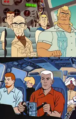 The series' principal reference is to the 1964 animated science fiction adventure television series Jonny Quest, as it is the basis for many of the main characters. Dr. Venture is modelled after what a child such as Jonny Quest might have grown up to be like after having lived through a childhood filled with bizarre, life-threatening events. Brock is modelled on Race Bannon. The Venture boys are based on the Hardy Boys and take the places of Jonny and Hadji. One newspaper critic remarked, "If filmmakers Woody Allen and Sam Peckinpah had collaborated on Jonny Quest, it would have come out a lot like this."[28] Despite the homage and references, Jonny Quest himself, as well as Hadji, Race Bannon, and their arch-nemesis, Dr. Zin appear as characters on the show. Cartoon Network, which owns the rights to Jonny Quest, restricted the use of their characters, with Jonny Quest appearing as "Action Johnny", and Dr. Zin as "Dr. Z".[29]