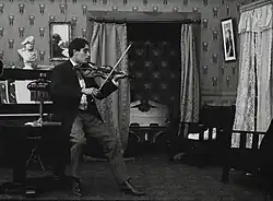 The Voice of the Violin is a 1909 short drama film directed by D. W. Griffith. It is preserved from a paper print at the Library of Congress and a 35 mm print at the George Eastman Museum.[1] Arthur V. Johnson is a musician, who makes a living with classes of violin. He and his student Marion Leonard like each other a lot, but she rejects him for being too poor for her. He then decides to join a communist group and fight for equality of all. Right away, he draws a lot to plant the next bomb in a rich man's house. With the plot under way, he realizes that this is the home of his love interest, and he desperately tries to prevent the bomb from exploding.