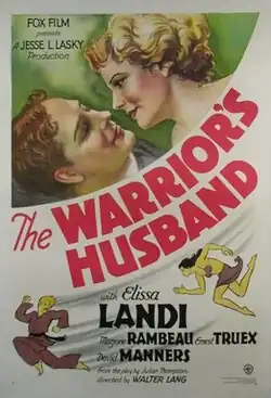 The Warrior's Husband is a 1933 American pre-Code comedy film directed by Walter Lang and starring Elissa Landi, David Manners, and Ernest Truex. It tells the story of the Amazons, who ruled over men thanks to the sacred girdle of Diana, and Hercules who came to steal it. The film is based on a 1932 Broadway production of Julian Thompson's 1924 play that starred Katharine Hepburn in the lead role.[1]
