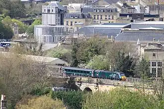 A GWR InterCity 125 at Bath Spa station wearing the special Y Cymro – The Welshman livery. | |