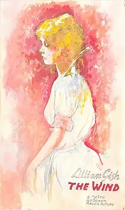 The Wind is a 1928 American synchronized sound romantic drama film directed by Victor Sjöström. While the film has no audible dialog, it was released with a synchronized musical score with sound effects using both the sound-on-disc and sound-on-film process. The movie was adapted by Frances Marion from the 1925 novel of the same name written by Dorothy Scarborough. Featuring Lillian Gish, Lars Hanson and Montagu Love, it is one of the last films released by Metro-Goldwyn-Mayer without audible dialogue and is considered to be among the greatest "silent" films.[1][2]