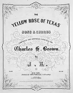 The earliest known version of "The Yellow Rose of Texas" is found in Christy's Plantation Melodies. No. 2, a songbook published under the authority of Edwin Pearce Christy in Philadelphia in 1853. Christy was the founder of the blackface minstrel show known as the Christy's Minstrels.[3] The song was uncredited in the songbook and it had no sheet music. In 1858, someone named J.K. revised the lyrics of the song and added a piano accompaniment to the song. Research in 2010 proposed that J.K. was John Kelly, who used the stage name J.K. Campbell, later J.K. Edward, as a member of the Christy's Minstrels. It is possible that J.K. was the original writer of the song.[4]