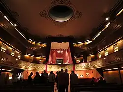 In 1842 the theatre was rebuilt in the Biedermeier style, and the red box theatre can be seen today. It eventually became an annex to the Royal Theatre, and in 1881 it was closed[5] due to new fire regulations, and most of the furnishings were sold. For a time the room served as a furniture warehouse. There were plans to convert it into a "speech stage" for DKK 600,000 but fire safety was a problem.[6]