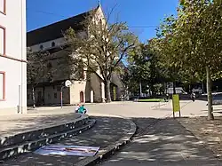 The former vineyard area to the west of the Theodorskirche was purchased in 1779 by council member Remigius Merian. After the last grape harvest, it was prepared for the long-needed extension of the regular churchyard; the first funeral took place on 5 October 1779. The new cemetery was enclosed by a wall and was named Merianscher Totenacker (Merian's Graveyard) after its former owner. Members of the lower social class were mainly buried there. However, as its capacity was quickly exhausted, two more areas were used as cemeteries, the Kleeacker in 1805 and the Mättelein in 1831; these too did not prove to be sustainable. In 1832, a new cemetery was established outside the city near the Messeplatz for the rapidly growing population of Basel. The Merianscher Totenacker near the Theodorskirche was closed as of 1 May 1833.[4] The Theodor schoolhouse, built in 1855/56, stands on the site of the former graveyard.[5]