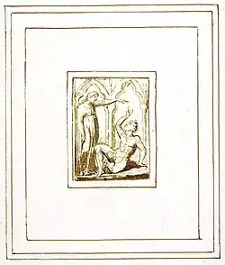 Blake himself referred to relief etching as "printing in the infernal method, by means of corrosives [...] melting apparent surfaces away, and displaying the infinite which was hid."[11] A contemporary description of the method was provided by Blake's friend, J.T. Smith; "writing his poetry, and drawing his marginal subjects of embellishments in outline upon the copper-plate with an impervious liquid, and then eating the plain parts or lights away with aquafortis considerably below them so that the outlines were left as Stereotype."[12]