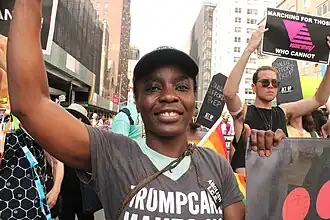 Therese Patricia Okoumou, commonly known as Patricia Okoumou, is a Black activist, most known for scaling the base of the Statue of Liberty in protest of children being separated from their parents at the Mexico-United States border in 2018.[1] She was credited by Hawk Newsome as "the most prominent Black voice in this immigrant rights movement right now."[2]