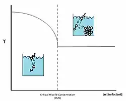 The critical micelle concentration (CMC) is the exact concentration of surfactants at which aggregates become thermodynamically soluble in an aqueous solution. Below the CMC there is not a high enough density of surfactant to spontaneously precipitate into a distinct phase.[7] Above the CMC, the solubility of the surfactant within the aqueous solution has been exceeded. The energy required to keep the surfactant in solution no longer is the lowest energy state. To decrease free energy of the system the surfactant is precipitated out. CMC is determined by establishing inflection points for pre-determined surface tension of surfactants in solution. Plotting the inflection point against the surfactant concentration will provide insight into the critical micelle concentration by showing stabilization of phases.[7]
