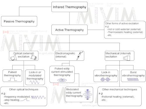 As depicted in the figure, there are three classical active thermographic techniques based on these two excitation modes: lock-in (or modulated) thermography and pulsed thermography, which are optical techniques applied externally; and vibrothermography,[14] which uses ultrasonic waves (amplitude modulated or pulses) to excite internal features. In vibrothermography, an external mechanical energy source induces a temperature difference between the defective and non-defective areas of the object. In this case, the temperature difference is the main factor that causes the emission of a broad electromagnetic spectrum of infrared radiation, which is not visible to the human eye. The locations of the defects can then be detected by infrared cameras through the process of mapping temperature distribution on the surface of the object.[14]