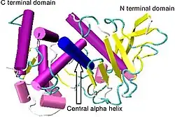 Thermolysin has a molecular weight of 34,600 Da. Its overall structure consists of two roughly spherical domains with a deep cleft running across the middle of the molecule separating the two domains. The secondary structure of each domain is quite different, the N-terminal domain consists of mostly beta pleated sheet, while the C-terminal domain is mostly alpha helical in structure. These two domains are connected by a central alpha helix, spanning amino acids 137–151.[7]