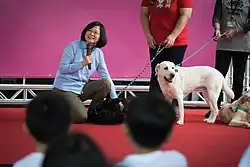 Tsai adopted the dogs in October 2016, and their names are Bella, Bunny and Maru. She signed their adoption papers at a ceremony organised by the Huikuang Guide Dog Foundation, where she vowed to improve the barrier-free environment for visually impaired people and their seeing-eye dogs.[25] Of the three dogs, Tsai has described Bella as her favourite; while Bunny is 'elegant' and Maru is 'timid'.[26] Bella died in September 2023, and Maru died in August 2024.[27] Tsai later adopted Lele and Pineapple.[28]