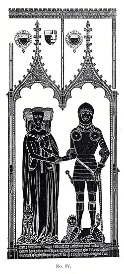 Camoys died on 28 March 1421[17] although as pointed out by Leland (d.1552), and still apparent today, the year of his death is wrongly given as 1419 (M CCCC XIX) on his brass in St. George's Church, Trotton.[18] He was succeeded in the barony by his grandson, Hugh de Camoys, 2nd Baron Camoys. From a court record in 1422, it would appear that he died intestate, with his estate being administered by Geoffrey Colet and William Estfeld[19] His monument survives in St George's Church, Trotton in the form of a 9-foot (2.7 m) chest tomb in the middle of the chancel on the ledger stone on top of which is a monumental brass depicting himself and his second wife Elizabeth Mortimer. The sides of the chest-tomb are decorated with sculpted quatrefoils and escutcheons. The brass is unusually large, the couple being depicted only slightly smaller than life-size and holding hands.[20] The monument was described by Ian Nairn and Nikolaus Pevsner as "one of the biggest, most ornate and best preserved brasses in England".[20] It is inscribed at the bottom in Latin as follows: