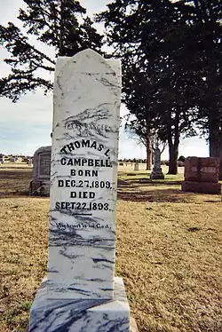 On September 22, 1893, Campbell died at the age of 83. He is buried in the historic Summit View Cemetery in Guthrie, Oklahoma where his headstone reads "Texas Ranger 1839, Thomas L. Campbell, Born Dec. 27, 1809, Died Sept. 22, 1893, My Trust Is In God"[8]