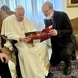 He speaks with church leaders like Pope Benedict XVI,[23] Pope Francis,[24] and the Ecumenical Patriarch Bartholomew I and gives lectures all around the world. He is considered one of the architects of the so-called “Christian witness in a multi-religious world”.[25] He is also consultant of the Faith and Order Commission, the Theological Commission of the World Council of Churches, chair of the Board of Advisors of the Central Council of Oriental Christians in Germany (ZOCD),[26] and Member of the International Committee of the Global Christian Forum.[27] Schirrmacher is also a member of the World Council of Religions for Peace[28] and of the Institute for the Freedom of Faith & Security in Europe (IFFSE) founded by Jewish rabbis.[29]