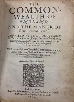 - ^ Thomas Smith (1609), The Common-vvealth of England, and the Maner of Gouernement thereof. Compiled by the Honovrable Sir Thomas Smith, Knight, Doctor of both Lawes, and One of the Principall Secretaries vnto two moſt Worthy Princes, King Edvvard, and Queene Elizabeth. With New Additions of the Chiefe Courts in England, and the Offices thereof by the ſaid Author. Alſo a Table Added thereto, of All the Principall Matters Contained in this Treatiſe. Newly Corrected and Amended, London: Printed [by John Windet] for Iohn Smethwicke, and are to be ſold at his Shop in S. Dunstones Church-yard, vnder the Diall, ISBN 9780521108058, OCLC 20191820
