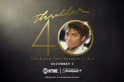 Thriller 40 is a 2023 documentary film about the 40th anniversary of Michael Jackson's 1982 album Thriller. The film, directed by Nelson George, was released in the United States on December 2, 2023. It aired on Showtime and was streamed on Paramount+ only for Showtime subscribers. Internationally, it debuted the same day in the U.K., Australia, Canada, Italy, France, Germany, Switzerland, Austria, Latin America, and South Korea.[1][2] On October 27, 2023, the trailer for the documentary was released.[1][3] A 40th-anniversary edition reissue of Thriller (1982) of the same title was released in 2022.