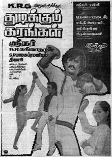 Thudikkum Karangal (transl. Shivering hands) is a 1983 Indian Tamil-language action drama film written and directed by C. V. Sridhar, and produced by K. R. Gangadharan.[1] The film stars Rajinikanth and Radha, while Jaishankar, Sujatha, Vijayakumar and Y. G. Mahendran play other supporting roles. The soundtrack was composed by S. P. Balasubrahmanyam, who made his debut as composer with this film in Tamil. It was average at box-office.[2]