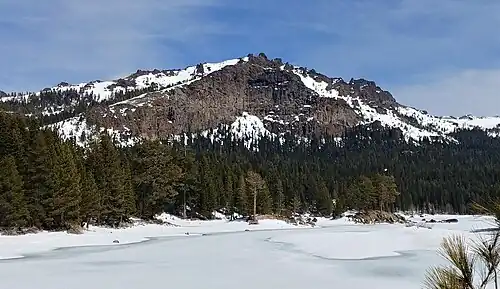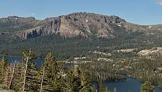Thunder Mountain in the Sierra Nevada of California is located east of Silver Lake and west of Kirkwood Mountain Resort[3] in the Eldorado National Forest. The mountain has two peaks, the 9,414-foot (2,869 m) main peak[1] and a 9,412-foot (2,869 m) sub-peak west of the main peak.[4] The main summit is the highest point in Amador County.[1] Due to the high elevation, most precipitation that falls on Thunder Mountain consists of snow.[5]