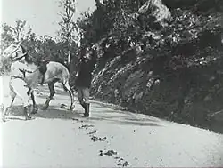 He befriends some aboriginal people, steals a racehorse, "Combo", and robs the Moonbi Mail Coach. He then enters "Combo" in a horse race and wins. He is rescued from a police trap involving Chinese by a half-caste girl, Sunday. He is grateful to her and they get married. He then holds up the Carlisle Hotel, and narrowly escapes. He takes on a boy apprentice and Sunday dies. Thunderbolt then dies in a shoot out with police on the riverbank at Uralla.[13][14]
