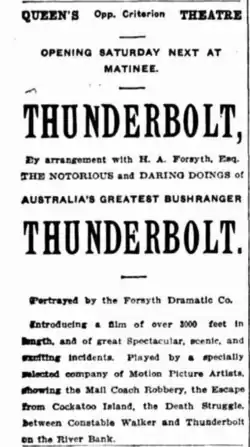 A film called Thunderbolt, about the bushranger, was screened in Wagga Wagga in February 1910.[23] It is unclear whether this is the Gavin film, which officially premiered in Sydney on 12 November 1910.[24]