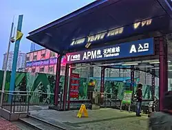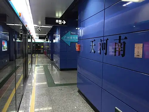 Tianhenan Station (Chinese: 天河南站; pinyin: Tiānhénán Zhàn; Jyutping: tin1ho4naam4 zaam6), formerly Tianhe 1st Road South Station (天河南一路站) during planning, is a metro station on the Guangzhou Metro APM line. It is located under the interchange of Tianhe 1st South Road (天河南一路) and Liuyun 2nd Street (六运二街) in the Tianhe District.[1] It started operation on 8 November 2010.[2][3] The station is unique in being the only station in Guangzhou with no escalator access to the platforms - instead 4 lifts carry passengers from the concourse to the platform, although there is a staircase for emergency use.