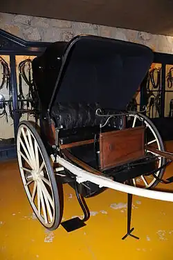 A tilbury is a light, open, two-wheeled carriage, with or without a top, developed in the early 19th century by the London firm of Tilbury, coachbuilders in Mount Street, London[1][2] (see also Stanhope (carriage)). A tilbury rig is little more than a single "tilbury seat"—the firm's characteristic spindle-backed seat with a curved padded backrest— mounted over a raked luggage boot, and fitted with a dashboard and mounting peg, all on an elaborate suspension system of curved leaf springs above the single axle. The tilbury has large wheels for moving fast over rough roads. A tilbury is fast, light, sporty and dangerous: