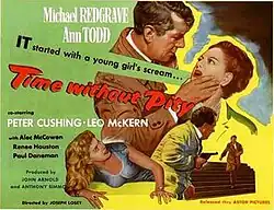 Time Without Pity is a 1957 British film noir thriller film directed by Joseph Losey and starring Michael Redgrave, Ann Todd, Leo McKern, Paul Daneman, Peter Cushing, Alec McCowen and Renee Houston.[3] It is about a father trying to save his son from execution for murder.