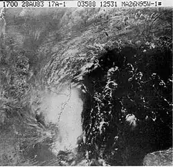 This season produced seven tropical depressions, of which four became named storms; three attained hurricane status, of which one became a major hurricane, a storm that ranks as a Category 3 or higher on the Saffir–Simpson scale.[3] The most notable storm in 1983 was Hurricane Alicia, which killed 21 people and caused $2.6 billion (1983 USD; $5.6 billion 2008 USD) in damages, making it the costliest storm, at the time, in Texas history.[4] As a result of its intensity, the name Alicia was subsequently retired from reuse in the North Atlantic by the World Meteorological Organization.[5] Another notable storm, Hurricane Barry, made landfall on Florida as a tropical storm, then, after crossing into the Gulf of Mexico crossing, strengthened into a weak Category 1 hurricane that traveled almost due west across the Gulf before making landfall in extreme northern Mexico.[6]