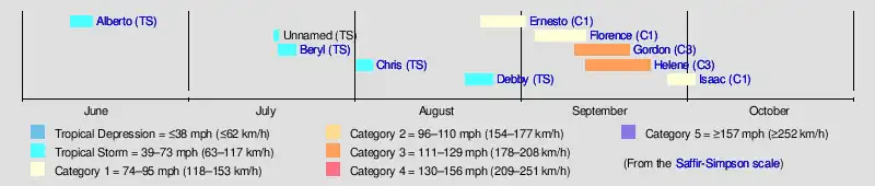 The 2006 Atlantic hurricane season was a cycle of the annual tropical cyclone season in the Atlantic Ocean in the Northern Hemisphere. The season officially began on June 1, 2006, and ended on November 30, 2006. These dates, adopted by convention, historically describe the period in each year when most subtropical or tropical cyclogenesis occurs in the Atlantic Ocean.[1] The first storm to form in 2006 was Tropical Storm Alberto on June 10;[nb 1] the last, Hurricane Isaac, dissipated on October 2.