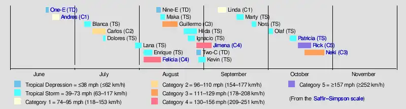 The 2009 Pacific hurricane season officially started on May 15 in the East Pacific Ocean, and on June 1 in the Central Pacific; they both ended on November 30. These dates conventionally delimit the period of each year when most tropical cyclones form in the Pacific basin. No tropical cyclones formed during the month of May, making 2009 the first time that no tropical cyclones formed during May since 1999.[1] The first tropical cyclone of the year, Tropical Depression One-E, formed June 18, and dissipated the following day. The first named storm of the season, Hurricane Andres formed on June 21. The final storm of the season, Neki, dissipaed on October 27.