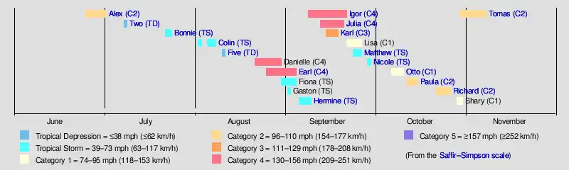 The 2010 Atlantic hurricane season was an event in the annual tropical cyclone season in the north Atlantic Ocean. It was one of the most active Atlantic hurricane seasons since record keeping began in 1851 as 19 named storms formed.[1][nb 1] The season officially began on June 1, 2010, and ended on November 30, 2010, dates that conventionally delimit the period of each year when most tropical cyclones develop in the Atlantic basin.[3] The first storm to form was Hurricane Alex, on June 25; and the last to dissipate was Hurricane Tomas, on November 7.