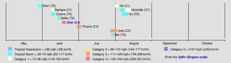 - 09:00 UTC (3:00 a.m. CST) at 11°54′N 93°36′W / 11.9°N 93.6°W – Tropical Depression Five-E strengthens into Tropical Storm Erick about 450 mi (725 km) southeast of Punta Maldonado.[22]