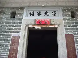 Historic buildings in the village include the Choi Ancestral Hall, also known as Chung Kwong Family Hall (宗光家祠), built around the 1920s,[7] the Leung Ancestral Halls (梁氏祠堂), two ancestral houses, largely rebuilt and occupied by tenants,[9][10] the Liu Ancestral Hall (廖氏祠堂),[7] and the Entrance Gate, built during the Qing Dynasty.[11] Two rectangular holes are above the front doorways of the Gate for feng shui benefit and for security watching.[4]