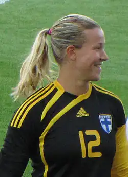 Tinja-Riikka Tellervo Korpela (born 5 May 1986) is a Finnish professional footballer who plays as a goalkeeper for Swiss Women's Super League club Servette.[2] She previously played for AS Roma in Serie A, Tottenham Hotspur in the FA WSL, Bayern Munich in the German Frauen-Bundesliga, Tyresö FF in Sweden's Damallsvenskan, LSK Kvinner and Kolbotn of Norway's Toppserien,[3] and FC Honka of Finland's Naisten Liiga.[4]