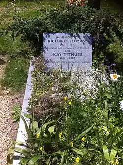 He married Kathleen ("Kay") Miller, a social worker. Their only daughter, Ann Oakley, has edited some of his works for recent re-publication, and has written a biography of her parents, Man and Wife: Richard and Kay Titmuss: My Parents' Early Years. In this she chronicles the important role Kay played in supporting his early work, and in co-authoring their book Parents' Revolt (1942), which focused on the decline of the birth rate.[11] Oakley has, however, also been critical of the role played by her mother in creating and promulgating the "Titmuss myth" of her father's poverty-stricken origins, stating that this was designed to elevate Titmuss as a "champion of equality and the welfare state transcending his own impoverished background through sheer hard work, a truly self-made man", and that Kay Titmuss sought to emphasise "how important she had been to (Titmuss's) success" in contrast to his parents.[12]